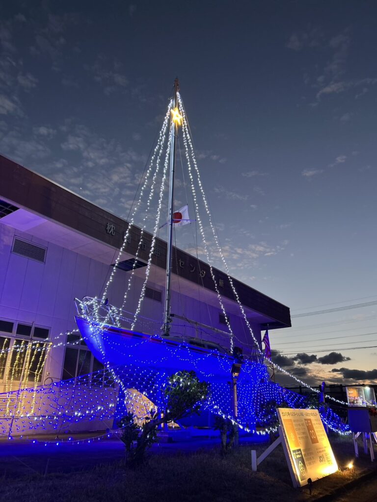 枕崎お魚センター西隣、海洋センター横広場に展示されているヨット「ガンバリ号」のイルミネーションが、今年も点灯を迎えました。