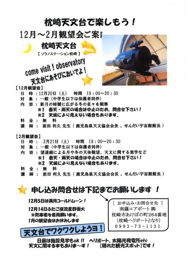 【枕崎天文台で楽しもう!】12月・2月の観望会ご案内