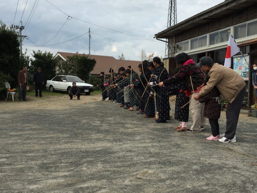 小江平地区に伝わるお正月の伝統行事。橙を転がし弓で射る子ども達の正月遊びで、矢が当たればその年は一年を息災に過ごせると言われています。
